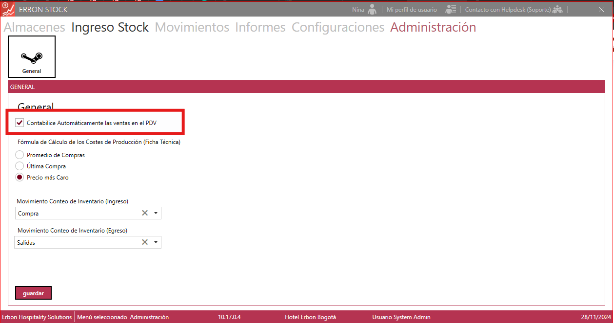 Para activar la Baja automática en stock y también para insertar un nuevo título en el financiero, seleccionando el producto y el centro de costos, también ingresará automáticamente en stock, la opción a continuación debe estar activada: