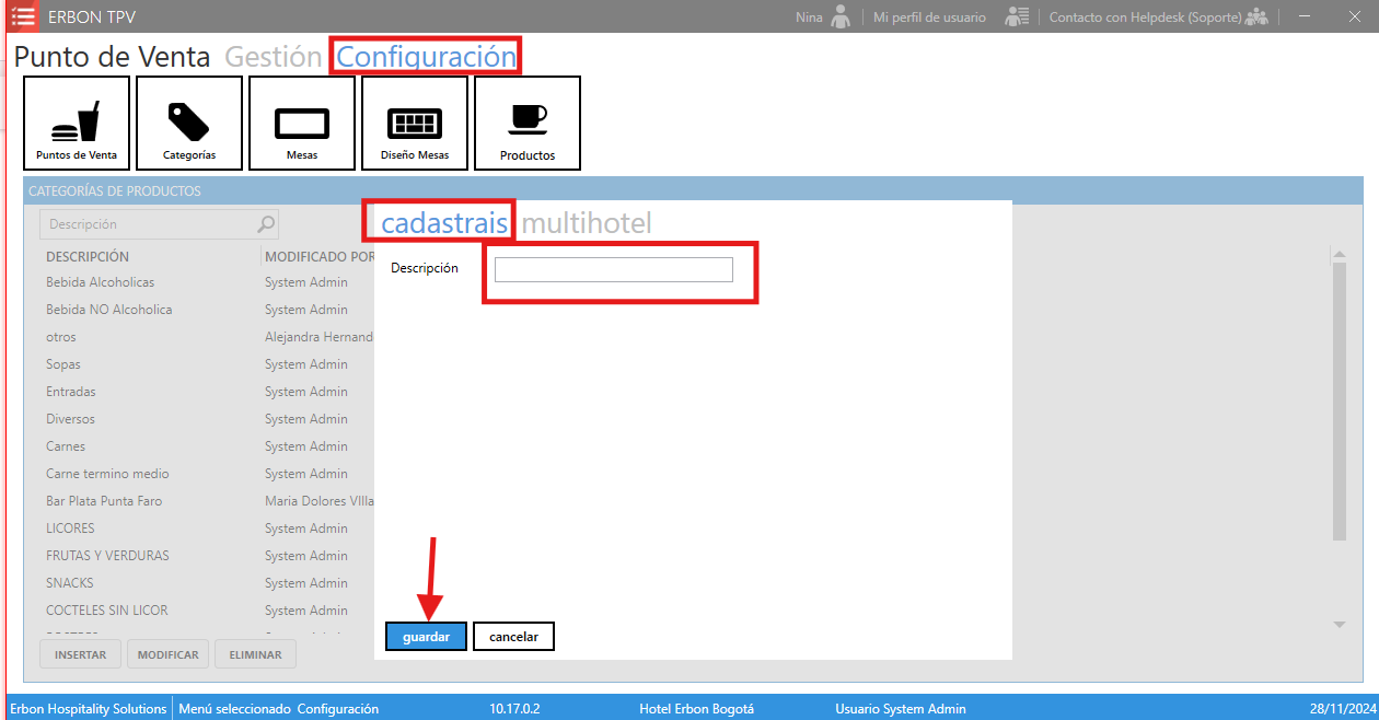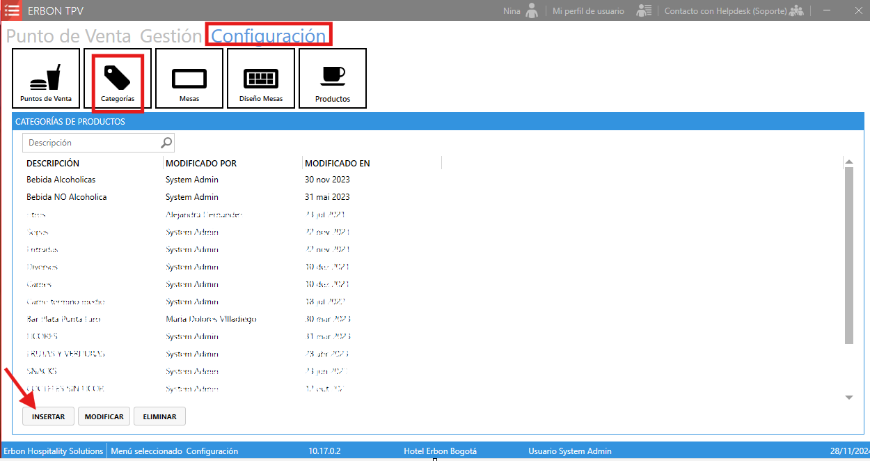 En el módulo TPV "Configuración", submenú "Categorías". Luego haga clic en insertar. Como se muestra a continuación: