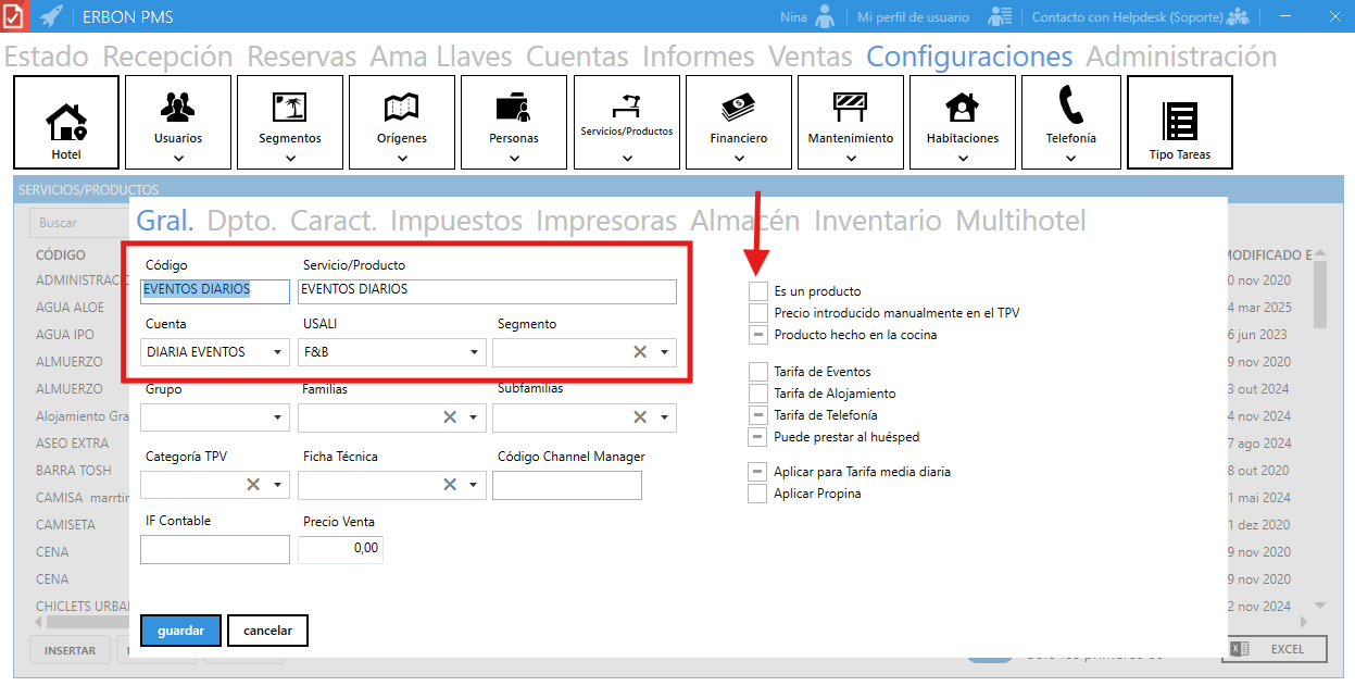 Acceda al módulo PMS y en el submenú Configuraciones, Servicios/Productos, (departamento) Incluir el departamento "Diária Eventos":