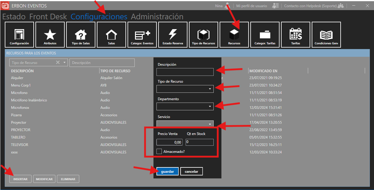 - Almacenado? Si el sistema puede controlar este recurso, si mi inventario completo está arrendado por ese período, si trato de llevarlo a otro evento, el sistema informará que no habrá disponibilidad de este recurso.