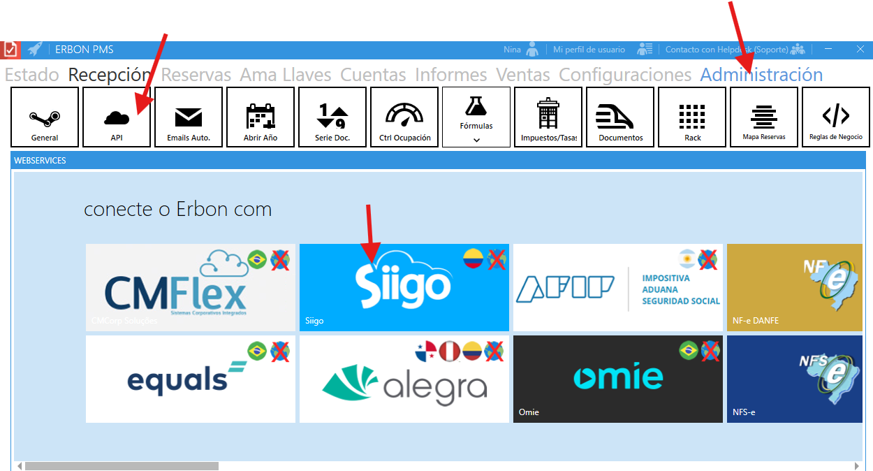 2. Desde Erbon pms >> administración >> API >> SIIGO >> modificar ID comprobante (recibo o factura) >> Guardar