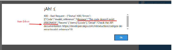 Este error ocurre cuando envías un ID o código que no existe. En el ejemplo arriba, el error nos muestra que el ítem 459 de servicio/producto erbon no está mapeado con siigo, y por eso, 'no existe'.