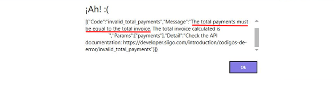 Error Siigo: The total payments must be equal to the total invoice