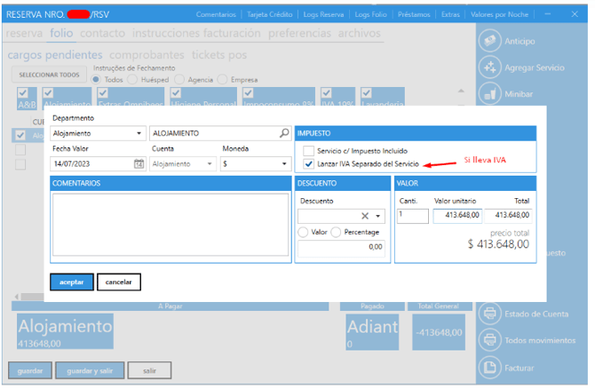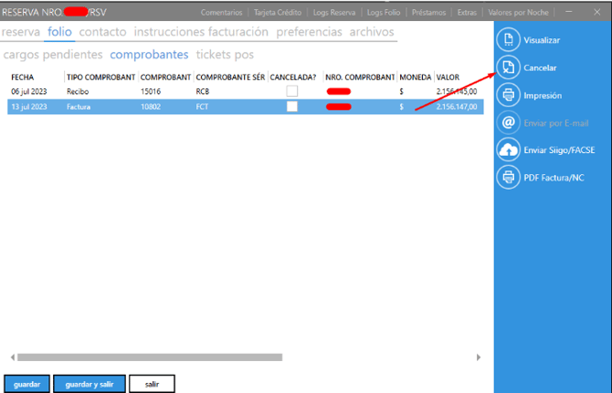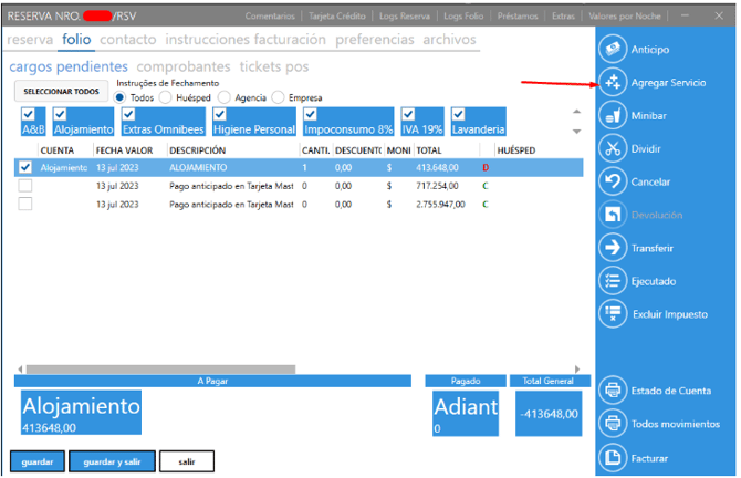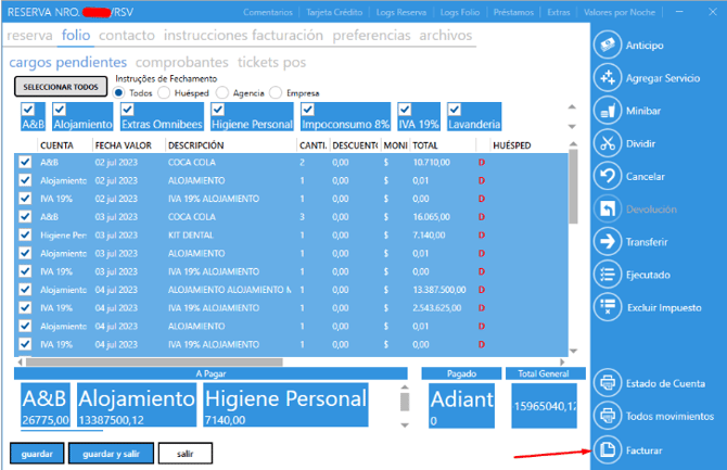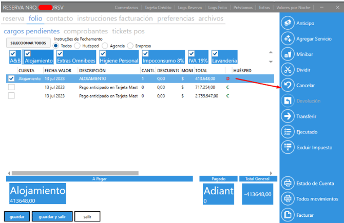 3. Vuelva a folio → cargos pendientes, selecciona todos los consumos y cancelar: