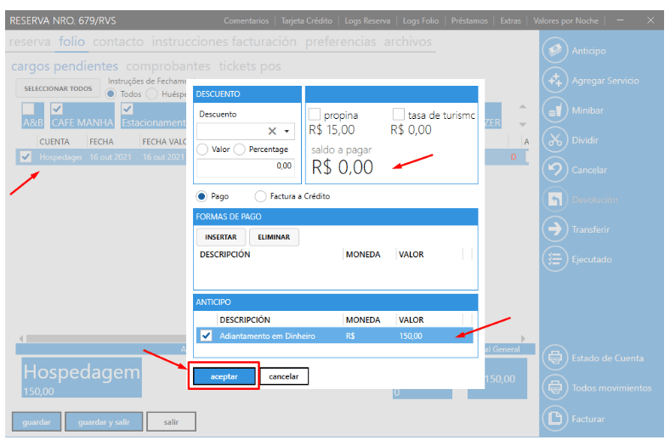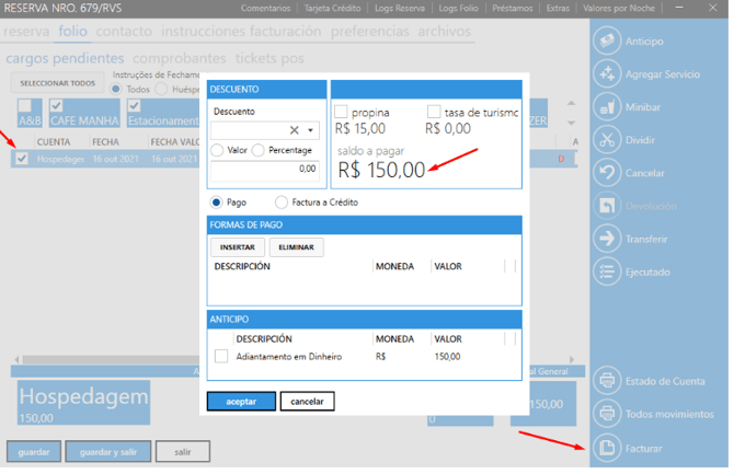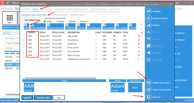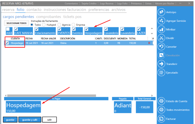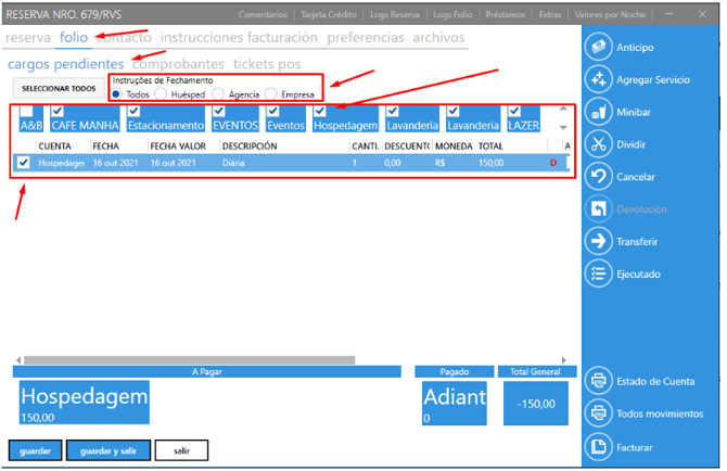 Seleccionando los filtros por instrucción de cierre (todos, huésped, agencia o empresa) o seleccionando la categoría de cuentas registradas en su unidad (F&B, alojamiento, estacionamiento, lavandería y otros).