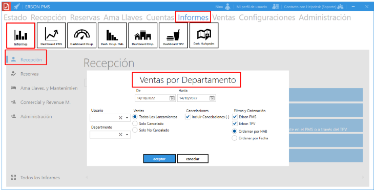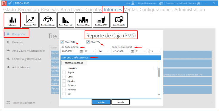 Informe de caja (PMS): para todo el día y para todos los empleados, con el fin de poder entregar a administración contable así comparar con los pagos realizados y el dinero ingresado al Hotel;