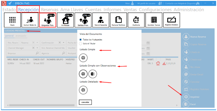 Llegadas Previstas: reservas programadas para la fecha actual;