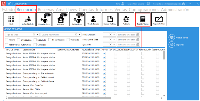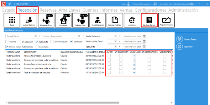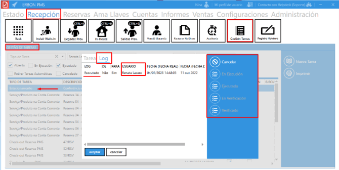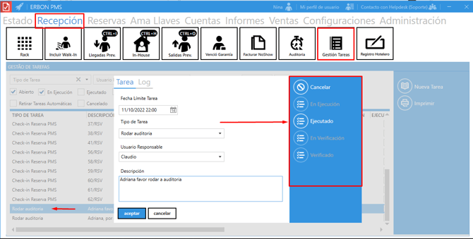 Pestaña Recepción GESTIÓN TAREAS - Cambiar el estado de la Tarea Manual