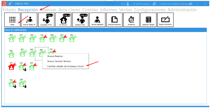 Haga clic con el botón derecho sobre el número de la habitación y luego en "Cambiar el estado de limpieza de la habitación"