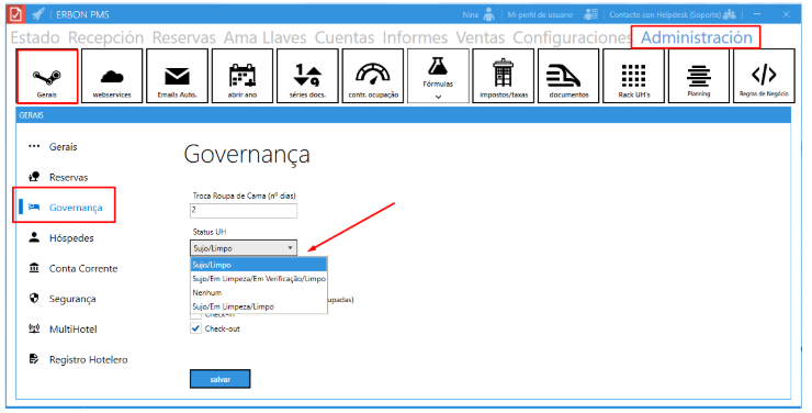 Caso ustedes no quieran trabajar con todos los status de limpieza, basta ir al Menú "Administración" >> Submenú "Generales" >> ítem "Ama de LLaves" ou "Gobernanza", indicando cuales son los status con los que quiere trabajar!