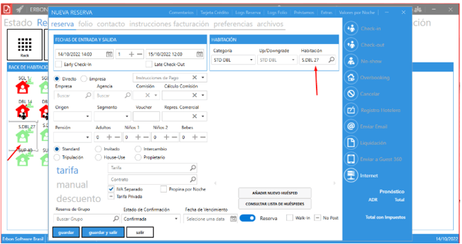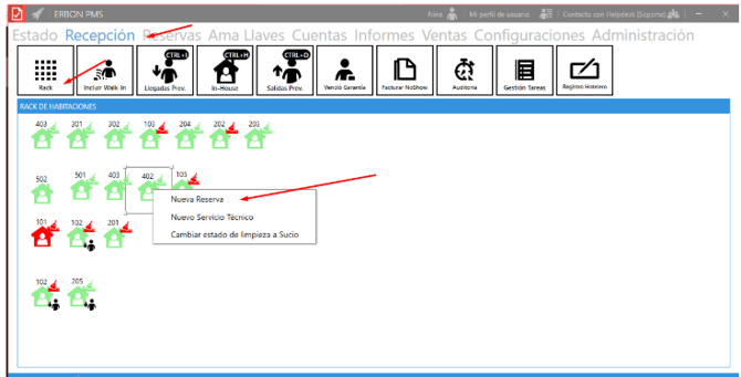 Al hacer clic con el botón derecho del mouse sobre el número de habitación se abrirá 3 opciones:
