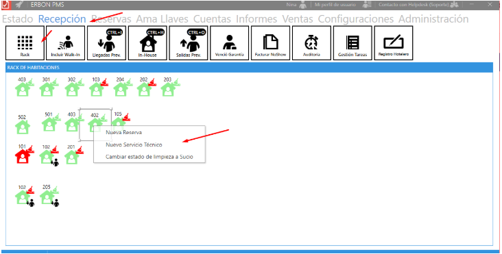 Para ingresar un nuevo mantenimiento en el Submenú "RACK", simplemente haga clic con el botón derecho del mouse sobre el número de habitación y elija la opción "Nuevo Servicio Técnico". Como se muestra en la imagen: