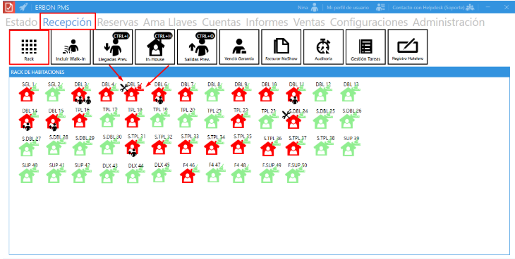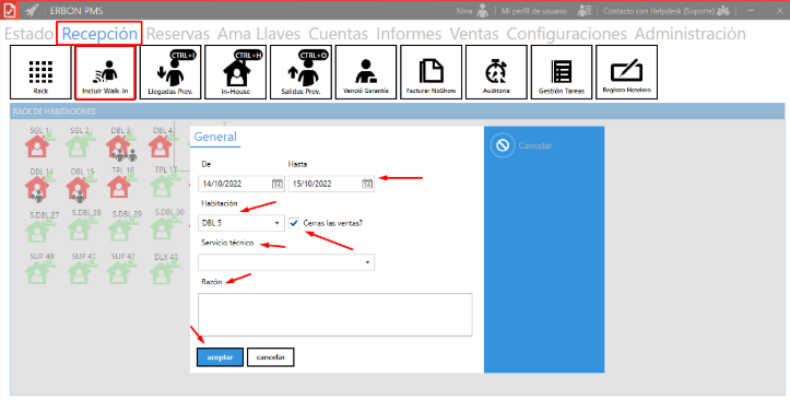 - La habitación ya viene pre seleccionado cuando se crea por el Menú "Recepción" >> Submenú "RACK"