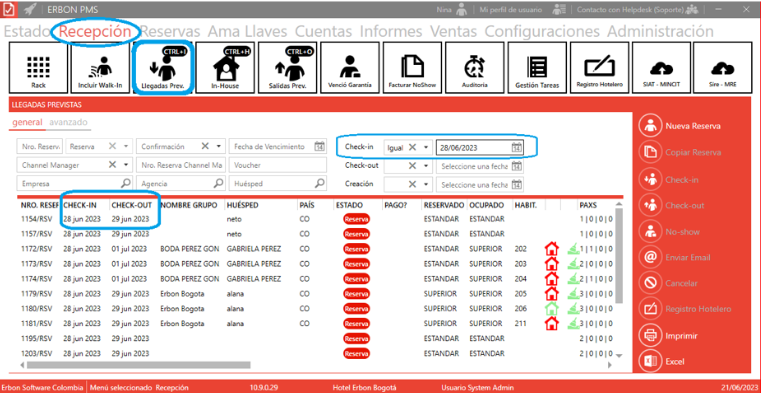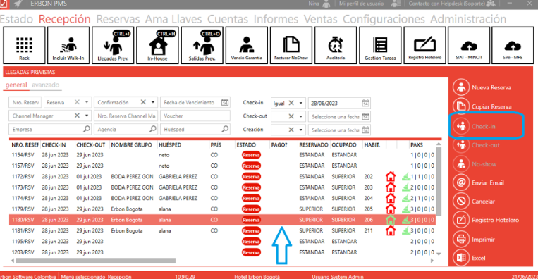 1. Para registrar a tus huéspedes dirígete al PMS>> Recepción>> Llegadas previstas. Seleccionas la reserva y presionas “Check In”