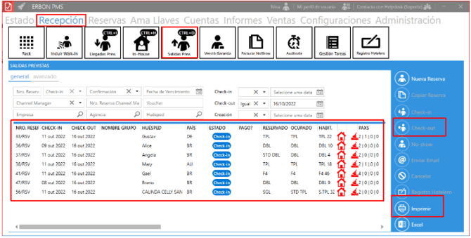 En el menú "Salidas Previstas", podrá ver todas las reservas cuya fecha de salida corresponde a la fecha actual en Erbon.