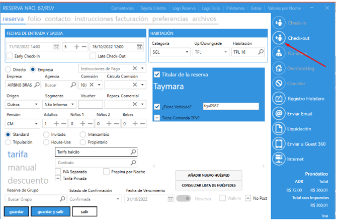 ¡Abra haciendo doble clic sobre la reserva para poder cerrar la cuenta y luego Check-out