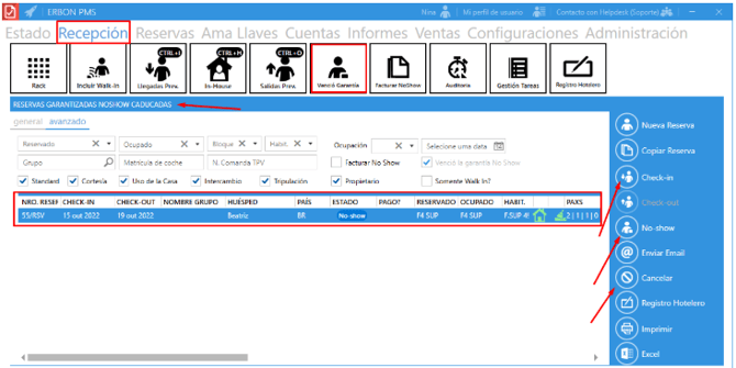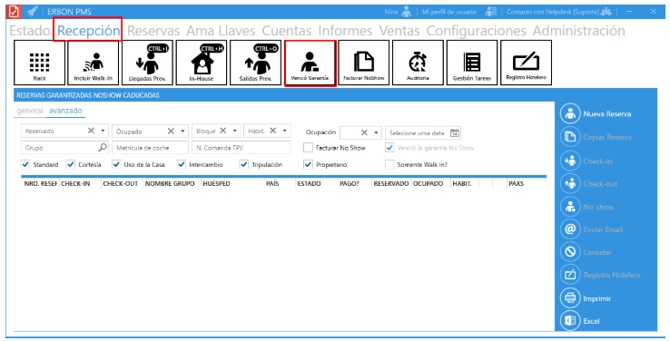 Al ejecutar la auditoría nocturna, si el huésped no ha llegado, la reserva pasará automáticamente a la pestaña "Garantía Vencida", ya que ha expirado el plazo de garantía establecido. En este momento, deberá tomar una decisión: