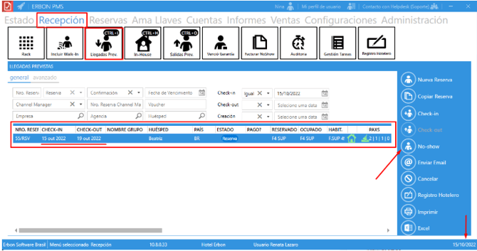 Hay una reserva con check-in para el 15/10/2022 y check-out el 19/10/2022, pero el huésped no se presentó ese día.