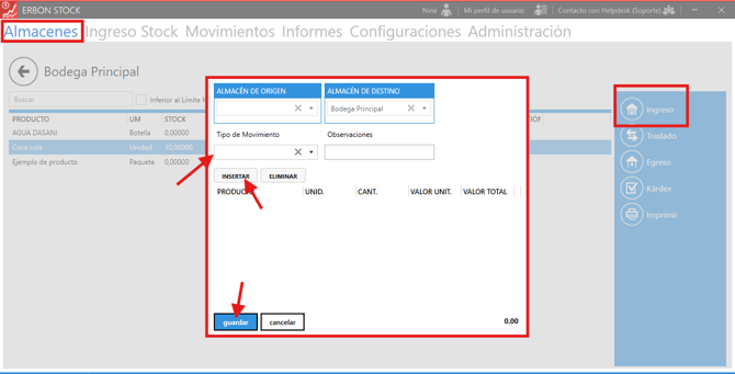 Simplemente acceda al Centro de Costos desde la pestaña Almacenes, seleccione el almacén correspondiente y haga clic en la opción "Ingreso" ubicada en la esquina superior derecha. Luego, complete la información requerida para registrar el ingreso manual.
