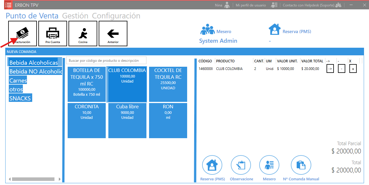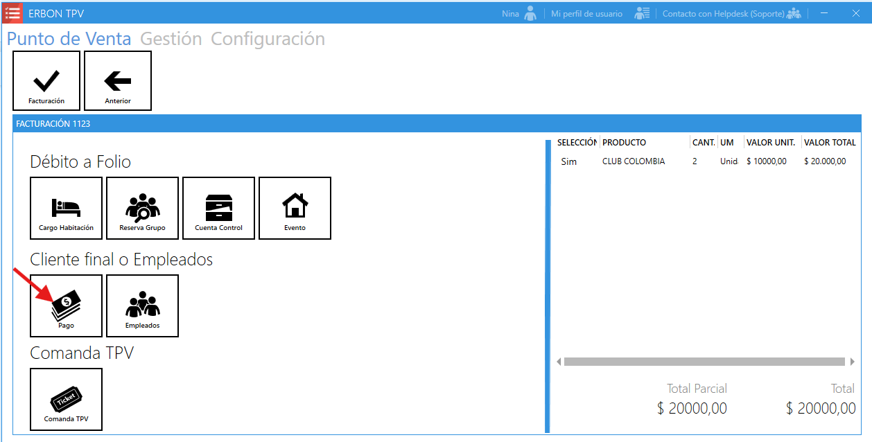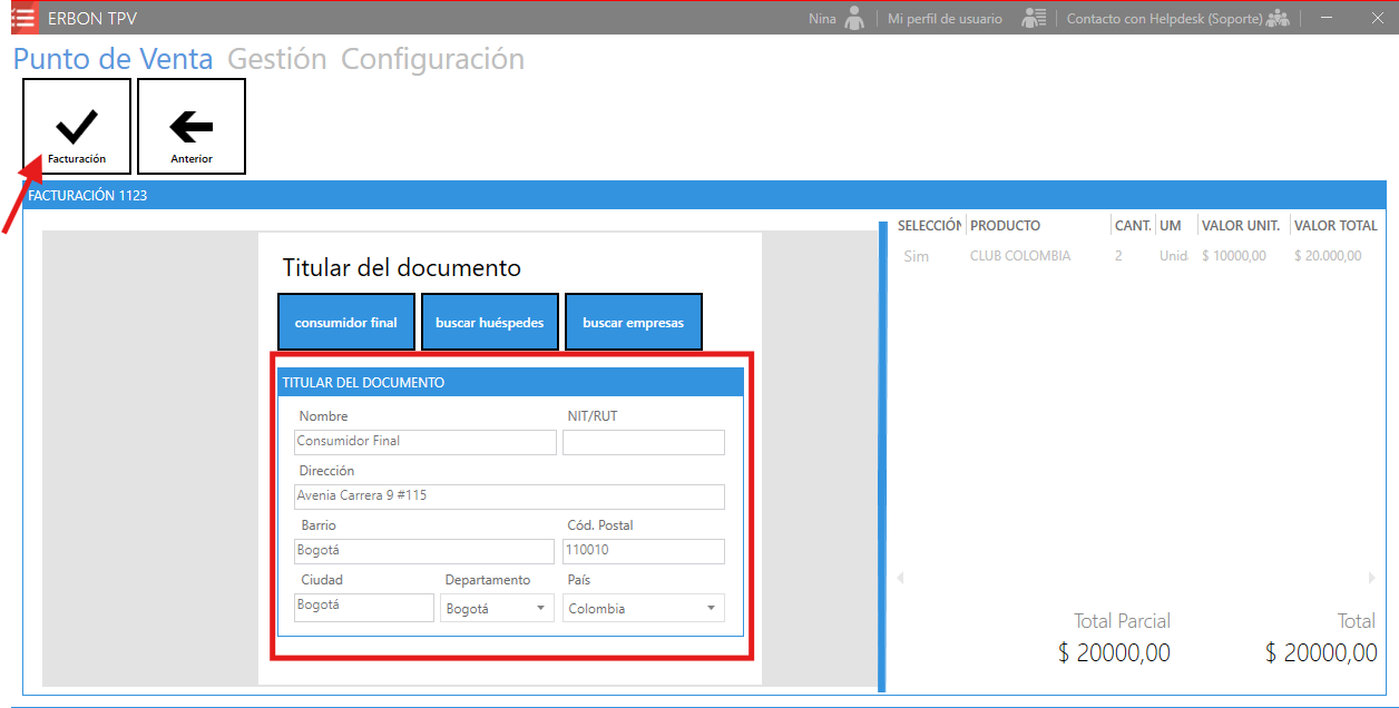 En la siguiente pantalla, seleccione los datos del invitado, o empresa, o cuando el cliente no quiera identificarse, haga clic en "Consumidor final", luego haga clic en Facturación: