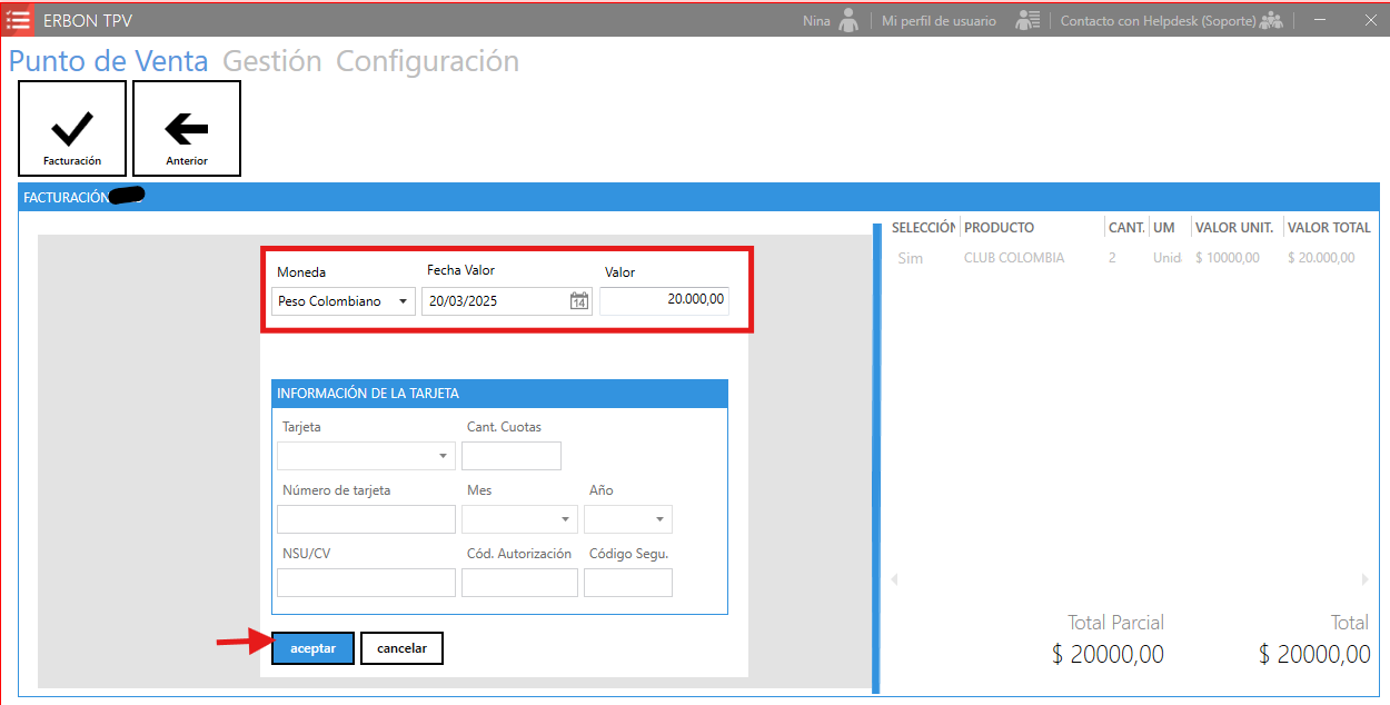 Seleccione la forma de pago y la fecha en que esta cantidad entró en el cuadro: