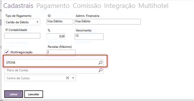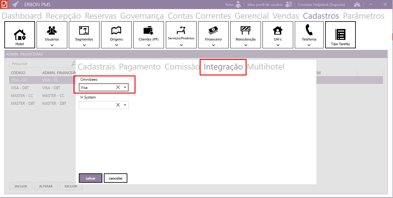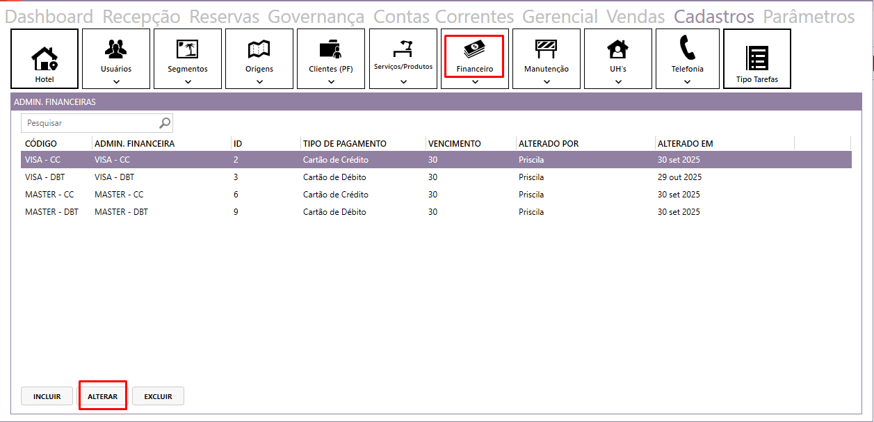 PMS → Cadastros → Financeiro → Admin. financeiras → Selecione a administradora que não integrou → Alterar