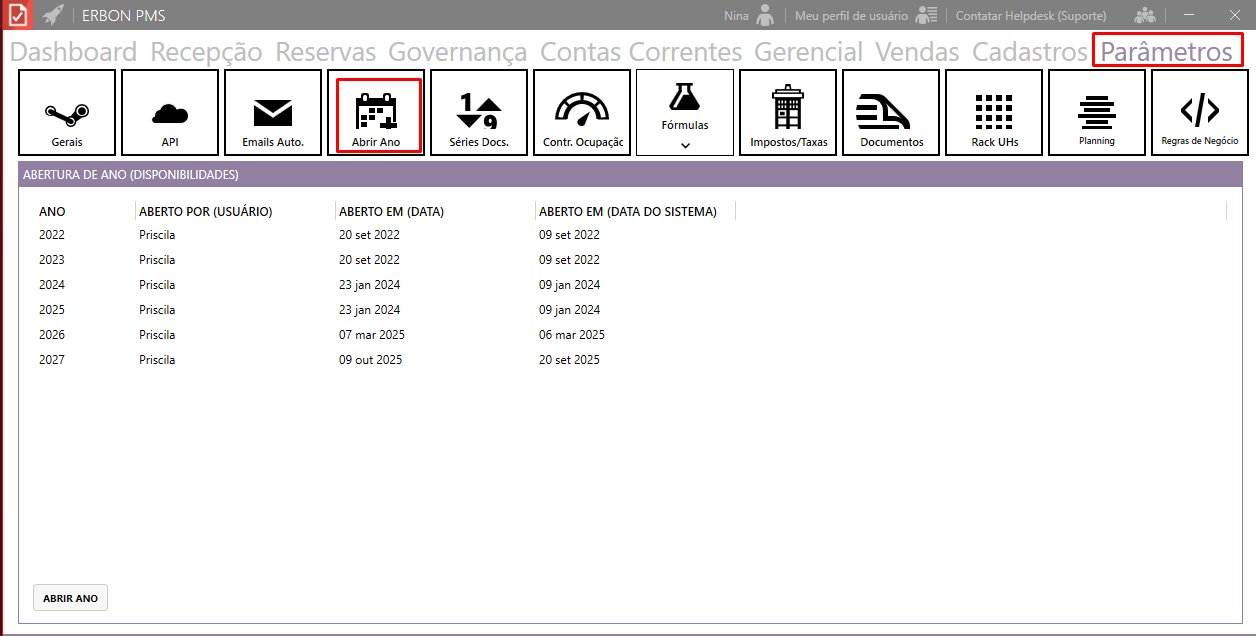 Hoje vamos aprender mais sobre a aba gerais/abertura de ano de parâmetros no PMS. Para chegar na tela vá em módulo PMS → Parâmetros → Abrir Ano.