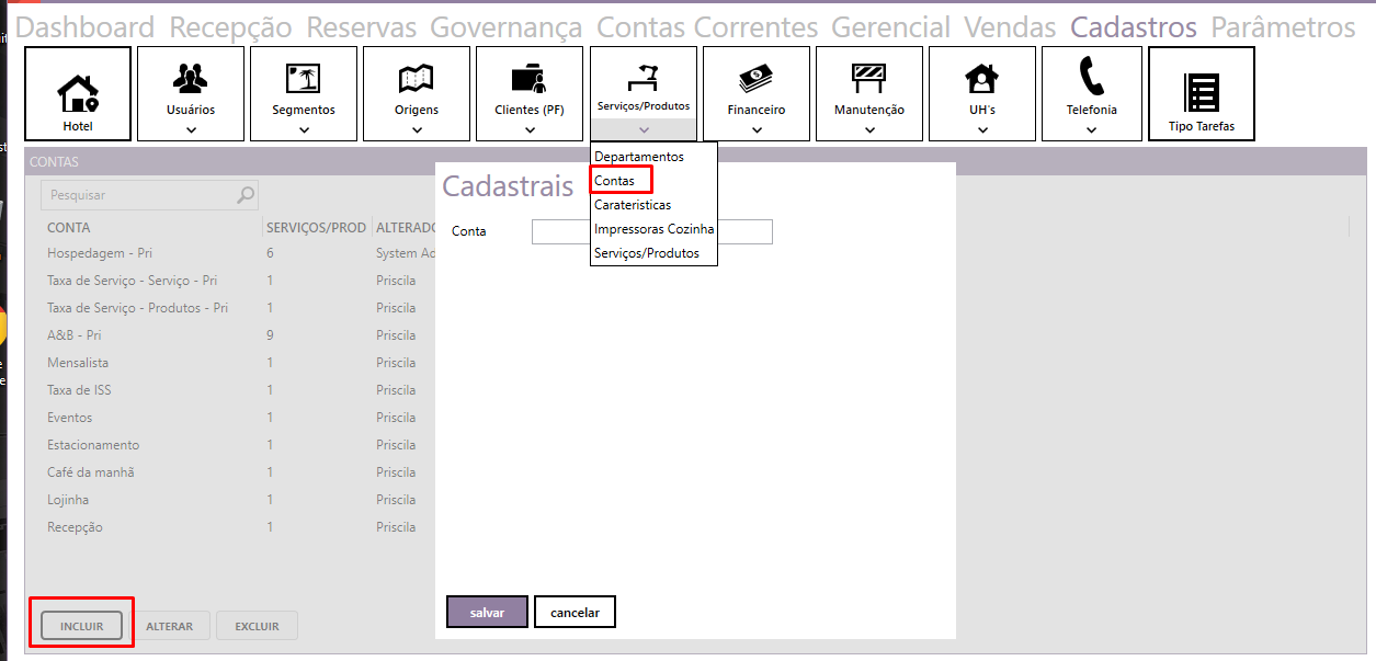 1 de Abril de 2025 Cadastro de Contas Olá! Ao cadastrar um serviço ou produto, é necessário vincular o departamento que o item será vendido. Vamos aprender a criar um departamento:Módulo PMS → Cadastros → Serviços e Produtos → Contas→ Incluir. Prontinho!