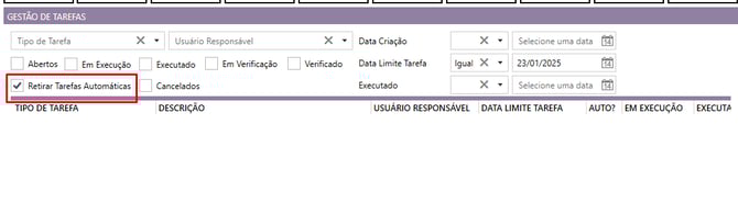 Ainda nessa tela de gestão de tarefas, é possível puxar os logs conforme abaixo das atividades realizadas, para conferir somente as tarefas criadas manualmente, basta manter a opção de retirar tarefas automáticas selecionado.