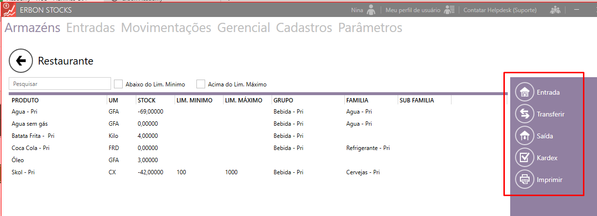 - Transferir: Transferir produtos de um centro de custo para outro centro de custo;
