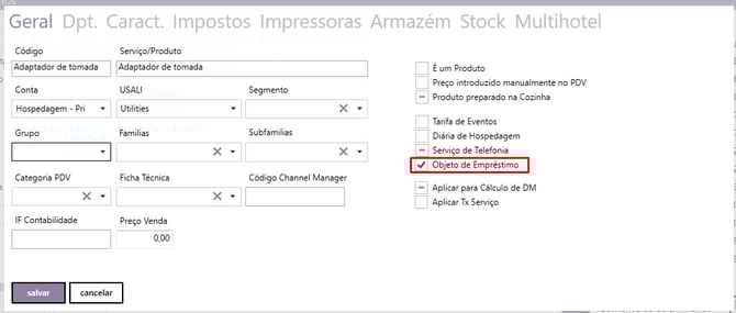 Aba Geral: Preencha as informações de acordo com o necessário e é fundamental que indique que é um objeto de emprestimo: