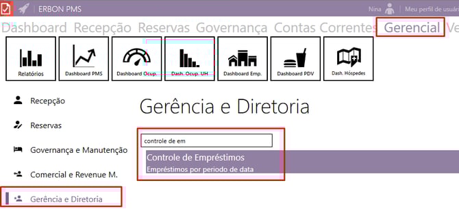 Módulo PMS → Gerencial → Relatórios → Gerência e Diretoria → Controle de empréstimos.