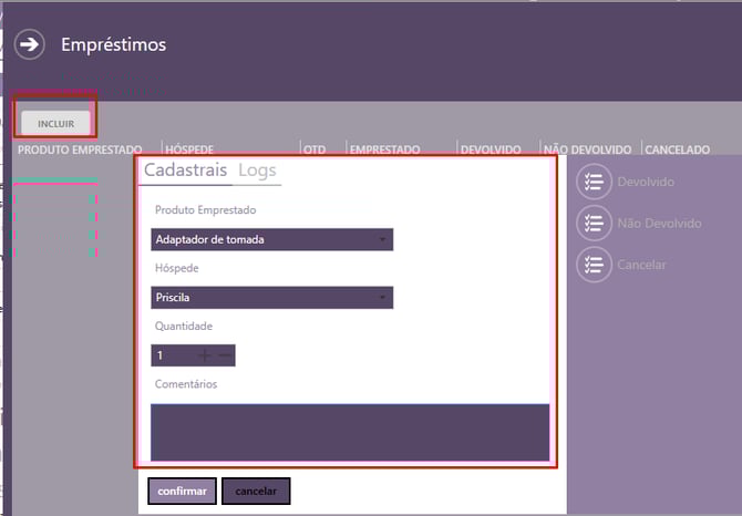 Selecione a opção incluir, e preencha as informações do objeto que será emprestado → Confirmar.