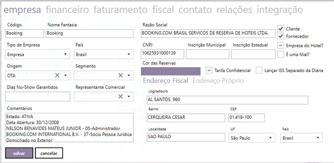- Empresa do Hotel: Para aparecer no financeiro como CNPJ do hotel.