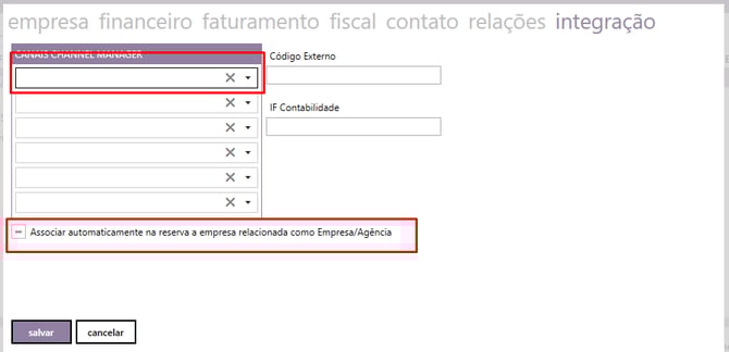 Exemplo: Se estou cadastrando a Booking, para eu saber quais são as reservas da Booking que migraram terei que na aba integração selecionar a opção "Booking" e também clicar para associar automaticamente na reserva a empresa.