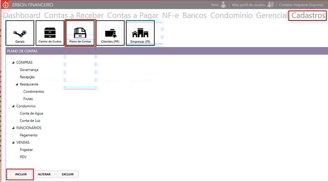 Módulo Financeiro → Cadastros → Plano de contas → Incluir