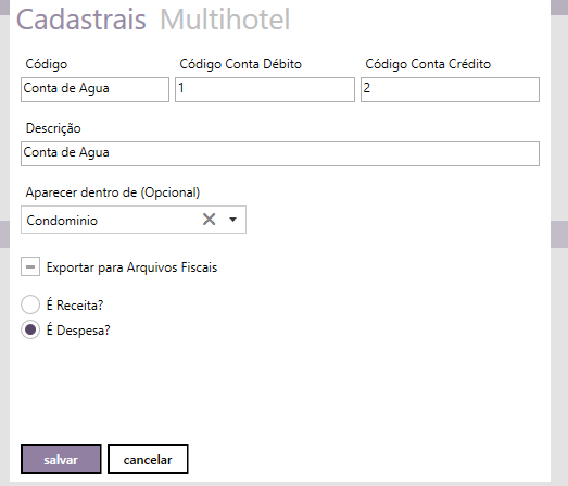Deve preencher os campos de código e descrição, não esqueça de indicar se é receita ou despesa. Após preencher tudo, clique em salvar.