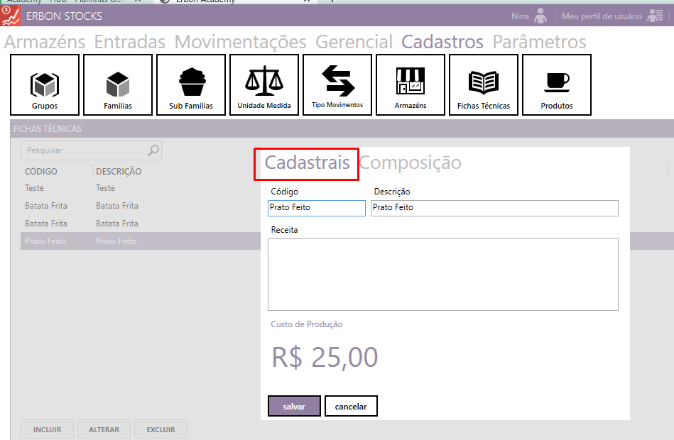 Módulo Stock → Cadastros → Ficha técnica, e clique em incluir → Cadastrais, insira o nome do prato → Composição, cadastre os produtos e quantidade usada.