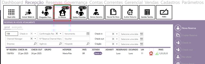Após dado o check-in, poderá visualizar esta reserva em In-house