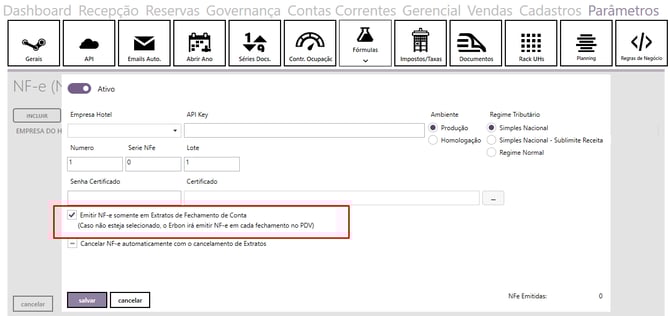 IMPORTANTE: Caso os dados fiscais não estejam preenchidos corretamente, e seu hotel tiver a emissão de NFC-e ou NF-e com o Erbon, as notas retornarão com erros. Se estiver na dúvida sobre qual valor cadastrar na parte de impostos fiscais, consulte o seu contador.