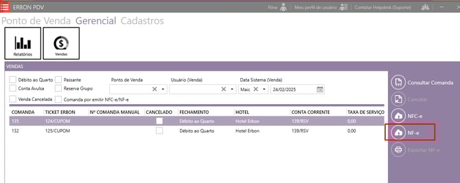 Gerencial → Vendas→ Selecione a comanda desejada → botão de NF-E a direita.