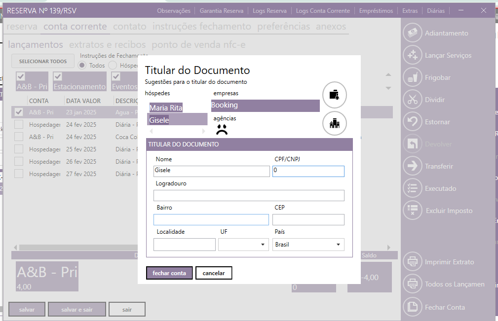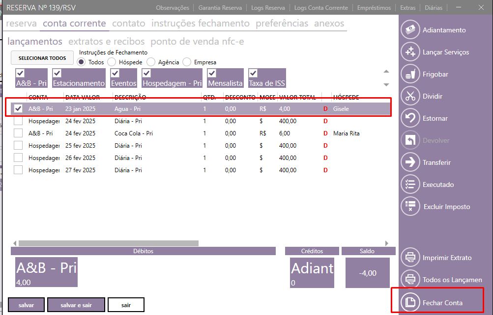Na conta corrente, na aba Lançamentos, selecione apenas o hóspede que deseja pagar e clique em fechar a conta. Selecione a forma de pagamento e em seguida abrirá a tela onde deve selecionar qual o hóspede pagará esta parte, com um duplo clique e feche a conta: