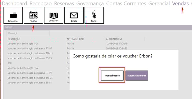 Módulo PMS → Vendas → E-mails → Incluir → Manualmente.