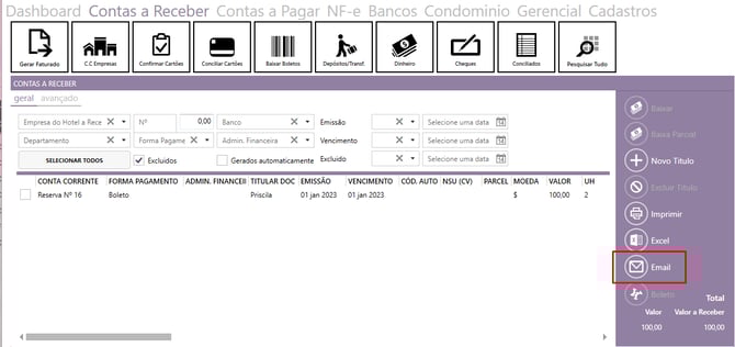 Módulo Financeiro → Contas a Receber → Baixar Boletos → selecione o boleto → E-mail