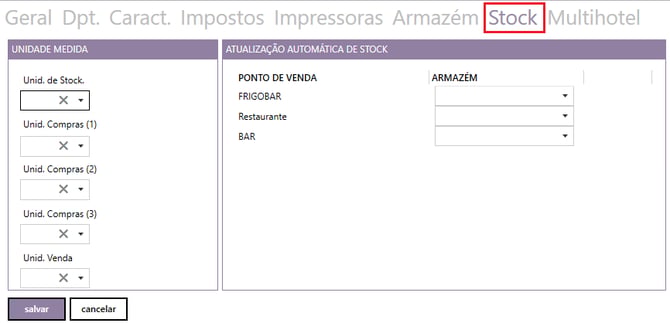 6. Na aba Atualização de stock, deve-se selecionar a unidade de medida utilizada e também o armazém onde será dada a baixa dos insumos utilizados no prato.