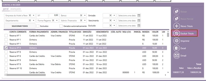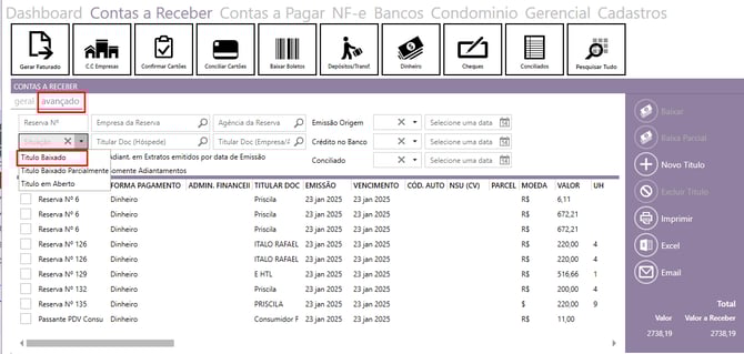 Sobre o filtro de banco no Contas a Receber, disponibilizamos esse filtro interligado com outro, ou seja, para ele funcionar, é preciso que seu hotel preencha também o filtro Data Crédito (Data).