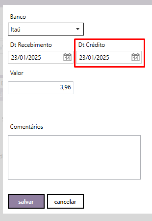 Ao escolher o banco e o período de datas (Data credito), o sistema lhe devolverá os lançamentos correspondentes.