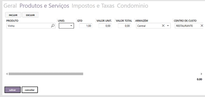 Quando efetuado compras podemos relacionar a produtos que darão entrada no estoque(se o parâmetro de baixa automática estiver ativado no stock), basta selecionar os armazéns dos produtos que darão entrada e a quantidade de cada produto: