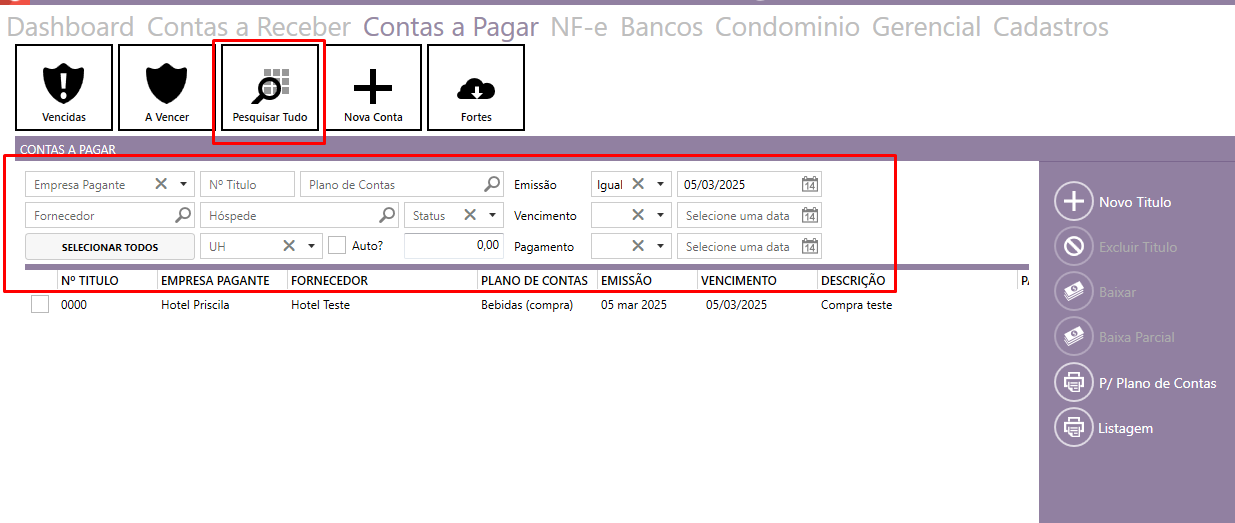 5 de Março de 2025 Contas a Pagar - Pesquisar Tudo Olá! No módulo financeiro, em contas a pagar, tem um filtro de pesquisar tudo, este leva em consideração qualquer filtro cadastrado, independente do status da conciliação. Prontinho!