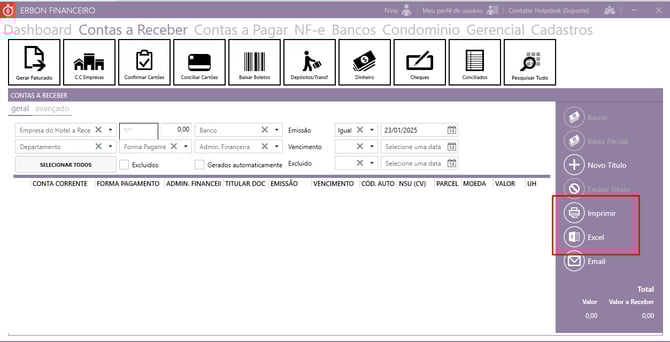 Neste campo é possível filtrar os títulos a receber, independente do seu status (baixado, parcial ou aberto). Além de poder extrair relatórios dessa tela, para extrair, basta clicar em Imprimir ou Excel.